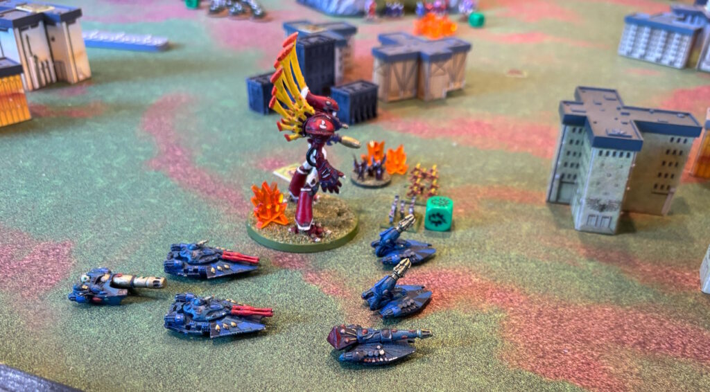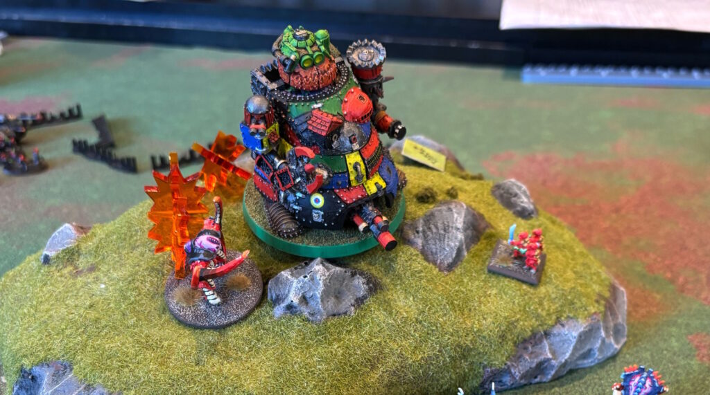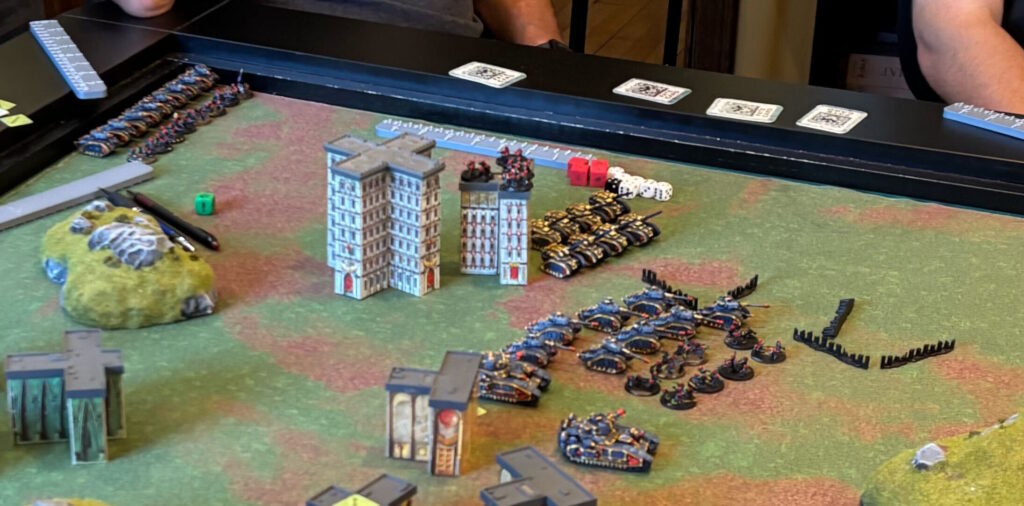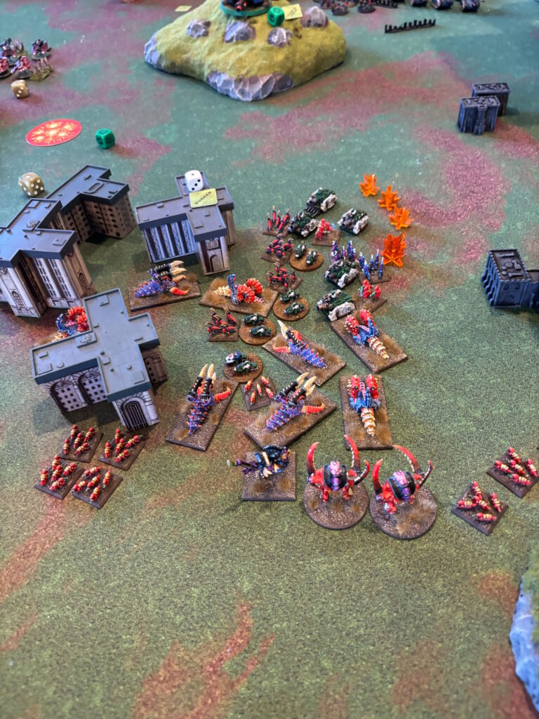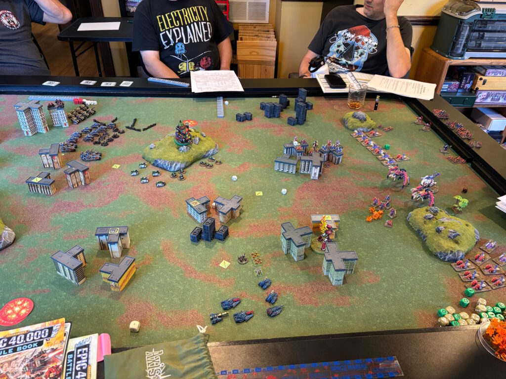 One of the dudes had models for the new game Legion Imperialis, so he brought a gigantic Leman Russ detachment, 8 griffons (for massive barrages) and a couple of Baneblades. It looked OK on the table with the 10mm scale difference, the Baneblades looking a lot like Ogres from the older game Ogre from Steve Jackson Games. He didn’t have a ton of infantry, which is probably good because they would just be meat for the grinder vs the ‘nids anyway.