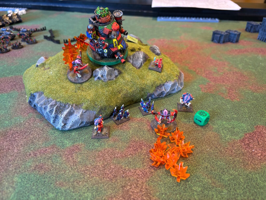 During turn 2 was when fully I realized that our choice to bring the Tyranids on the short table edge rather than the long was ANOTHER tactical mistake as it allowed the defenders to line up in a smaller area to shoot at the ‘nids as they came on, making it impossible to overwhelm any flank. To the south were the eldar, with the Eldar titan holding that side, and to the north was the onrush of the Imperial guard, but worse, the center was still held by the impenetrable great Gargant who was back up to 12 power fields after the useless aerial assault the turn before– this turned out to be the only Ork unit that got any action in the game as the other two gargants came on as reinforcements and could not stomp their way into battle.