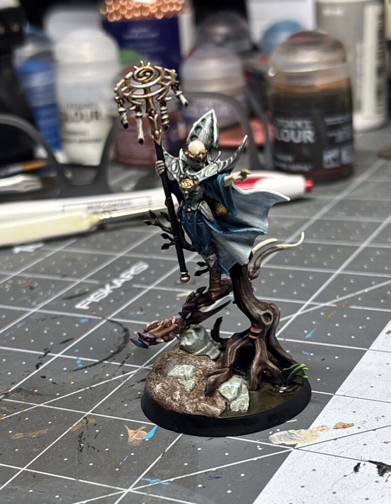 These models have molded bases that have a bunch of stuff on them. I’m not a huge fan of this but it suits these models. Again the base on Lorai was like painting another model though with the tree, mushrooms, water and these weird floating fish things flying around her feet. All of those things needed recipes of highlights, washes and shades and that took awhile. I pondered for several days on what to make the floating fish look like, and how to achieve the shiny water effect on the pond with what browns to use to make it look like muck. I pulled it off but it took way too long navel gazing.