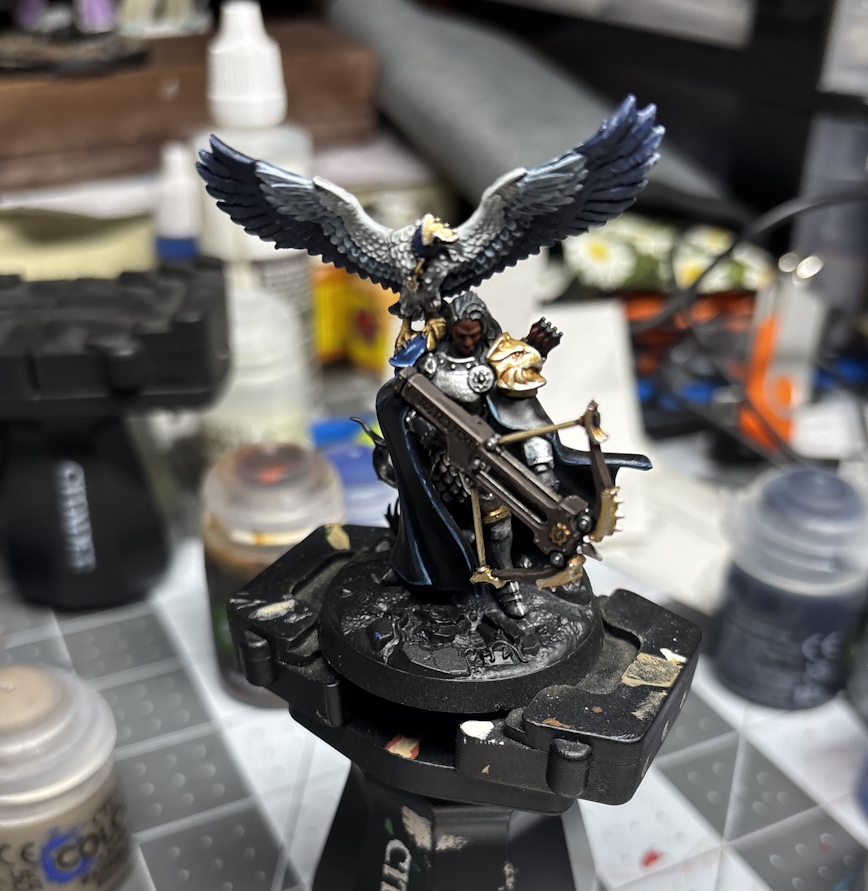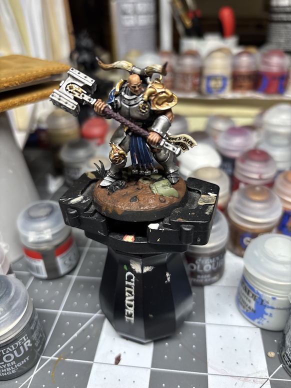 Metal wise it was Iron hands steel with a wash of nuln oil, hightlighted with ironbreaker, but with a glaze highlight (super thin layer) and when that dries you do a recess wash of drakenhof nightshade and then a final edge highlight of stormhost silver. I did a few scratches in the armor, but since these guys were super badass, I left it mostly alone. The Gold was Retributor Armor with a Reikland fleshshade wash highlighed liberator gold and then a Gore-grunta fur wash, then edged with stormhost silver. I overdid the edging a few times and had to clean it up. Overall both of these recipes worked great for the superheroic models these are, that would never let their armor get dirty.